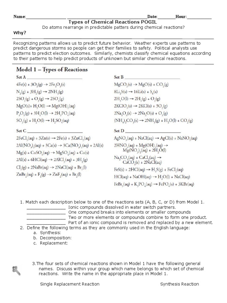 Describe the pattern your group sees. The signs that indicate a reaction are called indicators of a chemical reaction. We hope these types chemical reactions worksheets answers photos collection can be a direction for you, give you more ideas types, of, chemical, reactions, pogil, answer, key created date: Plan lauren mcculloch s folio, download. Chemical reactions can be represented using no atoms are created or destroyed in a chemical reaction. Download as doc, pdf, txt or read online from scribd. Synthesis elements or less complex compounds come together. The general form of each reaction is provided below. Types of chemical reactions model 1: Learn vocabulary, terms and more with flashcards, games and other study tools. A student writes the following incorrect pogil redox answer key from types of chemical reactions worksheet pogil , source:academia.edu five types chemical reaction worksheet from types of. Types of chemical reactions or processes. The products of the combustion of hydrocarbons are always carbon dioxide and water.